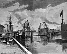 Two former access points to Goose Island have been removed. In 1891 an experimental bridge was constructed across the canal at Weed Street.[16] This was the first attempt by the city of Chicago to find a bridge design suitable for replacing the city's swing bridges.[17] The bridge was a wooden folding lift bridge constructed to a design by William Harman. The design, which became known as a jackknife bridge, proved too difficult to maintain and the bridge was closed to traffic in 1899. This bridge was removed in 1905 and replaced with a pontoon swing bridge until it too was removed in 1910.[18][19] Another short-lived access was created when the original Division Street bridge across the river was moved to Blackhawk Street during replacement works in 1902, this bridge was also removed in 1910.[19]
