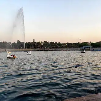 In 2012, the lake and the surrounding areas were renovated at the budget of around ₹22 crore (US$2.8 million). Around 90,000 square metres (970,000 sq ft) of land was renovated, where the 212 metres (696 ft) diameter lake covered almost 35,000 square metres (380,000 sq ft) of area.[8] The lake can hold 120,000,000 litres (26,000,000 imp gal; 32,000,000 US gal) of water.[9] The renovated surroundings include amphitheater and fountain plaza.[3] The area has been divided into seven zones; the diamond zone, food zone, environment zone, history zone, communal harmony zone, textile zone and Surat nu Jaman.[8] The Surat Municipal Corporation has outsourced the operation and maintenance of these to a local company called Rajhans Entertainment which would develop an amusement park called "Future Zone" and also pay an annual royalty of ₹30 lakh (US$38,000) to the Corporation.[9] The first phase was inaugurated on 5 December 2015 by Chief Minister of Gujarat, Anandiben Patel.[10]