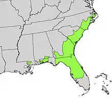 Loblolly-bay is continuously distributed along the Atlantic and Gulf Coastal Plains from Coastal Southern Virginia to the Appalachicola River in the Florida Panhandle. Discontinuous populations exist in Florida, the coastal counties of Alabama, the coastal counties of Mississippi, south and southeast Texas, and southern Louisiana. In South Carolina it is commonly found in the lower Coastal Plain, but in the middle and upper Coastal Plain it is restricted to specific sites.