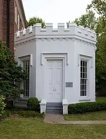 This small octagonal building with crenelations originally served as the guard house of the university. It was completed in 1860 during the conversion university into a military campus, intended to be a shelter for sentries from inclement weather.[10] As tensions between the North and South escalated, the request for the transition came from the university president of the time, Landon Cabell Garland.[3] Ironically, the Little Round House, despite its military associations, was one of the few structures that remained after Federal troops burned the campus. When the university reopened its doors in 1871, the building was used as a physician's office. A few years later the building was considered for demolition due to its deteriorated condition. It was saved by the university trustees and converted into a records repository. It became known as Jasons Shrine during the 1930s, while being used by the Jasons, a men's honor society. 1990 saw the structure converted into a memorial for all university honor societies.[8][9]