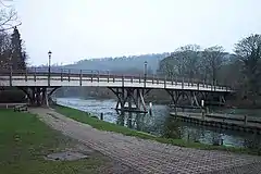 A bridge was first built here in 1837 being a flat timber bridge of beams on posts. Prior to this there was a ferry although occasionally people would ride across, even driving in a one-horse chaise. In 1674 the ferry turned over in the weir pool with the loss of sixty lives.[2] In the 1970s a Citroën Dyane crashed through the railings at the Streatley end of the bridge landing on a concrete weir 16 feet below. The local Citroën dealer used the photo to illustrate the inherent strength of their upmarket 2CV.