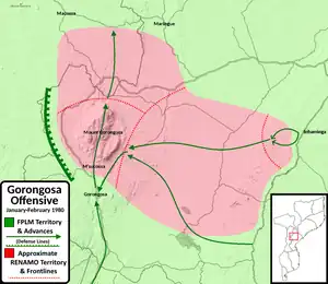 The offensive was planned by the Soviets who had advisors present in Beira during the operation. Additionally, prior to the attack Frelimo offered amnesty to any RENAMO rebel who surrendered with their weapons.[2] The offensive began in January with the destruction of the RENAMO base near Inhaminga which was captured through an artillery shelling followed by a two-pronged assault that quickly captured the camp. The next day Frelimo forces began advancing from the Dondo-Inhaminga road westwards towards the main base on Gorongosa Mountain however their forces became bogged down in wet and muddy terrain traveling through the Gorongosa National Park which took the soldiers two days to reach their next positions near the east side of the mountain. South of the town of Gorongosa another brigade was moving northwards on the Inchope road toward the town where eventually all the forces would meet to launch an assault on the main base on the Gorongosa Mountain. RENAMO instead of facing the large number of Frelimo forces decided to retreat from their bases on the Gorongosa Mountain and surrounding areas and the offensive came to a close in February with Frelimo drawing down their presence in the region on 5 March.[4][11]