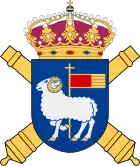 The coat of the arms of the Gotland Artillery Regiment (A 7) 1977–2000. Blazon: "Azure, the provincial badge of Gotland, a ram passant argent armed or, banner gules with crosstaff, edging and five flaps or. The shield surmounted two gunbarrels of older pattern in saltire or. The gunbarrels may be sable".[10]