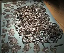 On 16 July 1999, the world's largest Viking silver treasure, the Spillings Hoard, was found in a field at Spillings farm northwest of Slite.[25] The silver treasure was divided into two parts weighing a total of 67 kg (148 lb) (27 kg (60 lb) and 40 kg (88 lb)) and consisted mostly of coins, about 14,000, from foreign countries, mostly Islamic.[26] It also contained about 20 kg (44 lb) of bronze objects along with numerous everyday objects such as nails, glass beads, parts of tools, pottery, iron bands and clasps. The treasure was found by using a metal detector, and the finders fee, given to the farmer who owned the land, was over 2 million kronor (about US$308,000).[27] The treasure was found almost by accident while filming a news report for TV4 about illegal treasure hunting on Gotland.[28]