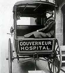 Gouverneur Hospital opened in 1885, in a three-story building in Manhattan's Financial District. It was New York City's 19th municipal hospital,[10] serving residents of the Lower East Side, a neighborhood that was at the time expanding with European immigration.[11] It was the first public hospital in the United States to create a tuberculosis clinic, and the first to employ a female ambulance surgeon, Dr. Emily Dunning Barringer.[5] When the hospital opened in 1885, its sole intent was to treat accident cases. Any patient needing to stay overnight was sent to nearby Bellevue Hospital. This soon changed – about two years after opening, the hospital had 40 beds in use. An 1894 article in the New York Times stated that Gouverneur did not have the resources or the space to properly serve the growing community.[12]