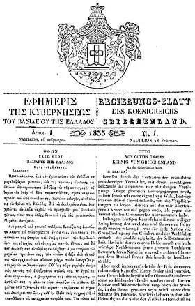 The Government Gazette (Greek: Εφημερίδα της Κυβερνήσεως, romanized: Efimerida this Kyverniseos, lit.'Government Gazette'; Katharevousa: Ἑφημερίς τῆς Κυβερνήσεως) is the official journal of the Government of Greece which lists all laws passed in a set time period ratified by Cabinet and President. It was first issued in 1833. Until 1835, during the regency on behalf of King Otto, the gazette was bilingual in Greek and German. No law in Greece is valid until its publication in this journal. Foundations, duties and rights of juridical persons should be published in this journal.