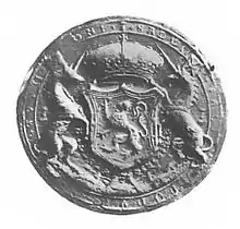 The Chancellor was effectively the first minister of the kingdom. His department, the chancery, was responsible for the Great Seal, which was needed to process the inheritance of land titles and the confirmation of land transfers. His key responsibility was to preside at meetings of the privy council, and on those rare occasions he attended, at meetings of the court of session.[12] The second most prestigious office was the Secretary, who was responsible for the records of the Privy council and for foreign policy, including the borders, despite which the post retained its importance after the Union of Crowns in 1603.[13] The Treasurer was the last of the major posts and, with the Comptroller, dealt with the royal finances until the Comptroller's office was merged into the Treasurer's from 1610.[14]