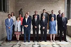 Puigdemont's cabinet governed Catalonia from 11 January 2016 to 27 October 2017, a total of 655 days, or 1 year, 9 months and 16 days.[28] It was composed of members of Democratic Convergence of Catalonia (which was dissolved on 8 July 2016, replaced by the Catalan European Democratic Party on 10 July 2016), Republican Left of Catalonia, and some independents, all part of the JxSí electoral alliance.