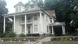 The east and south sides of the house are decorated with Ionic columns. The front has a bay window decorated with an open balcony on the first and second stories, which extends into a gable on the third story. The first two stories are rounded on the south end extend into a turret on the third story. A balcony across the second story on the front of the house extends from the bay window to the rounded portion of the house. Except for the windows in the gables, all other windows are double hung. Those in the gables are four by six fixed type style.[2]