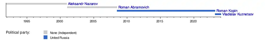 Nazarov was succeeded by Roman Abramovich, a Russian oligarch and member of the 3rd State Duma from the Chukotka constituency. According to media reports, he invested a lot of his own funds in the development of the region and improving the living standards of the local population.[2] Abramovich asked president Putin to accept his resignation at least two times: in December 2006, and in the fall of 2007, but these attempts were unsuccessful.[3] He resigned in July 2008 and was succeeded by Roman Kopin, former head of Bilibinsky District.[4] Kopin was succeeded by Vladislav Kuznetsov, after the former resigned in March of 2023.