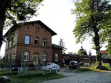 The station building is located southwest of the tracks. It is a Neoclassical, two-storey building with five portals on its long side and three portals in the transverse direction with a gable roof and a mezzanine (that is a low storey). In both directions, the building had an avant-corps with a triangular gable, so that it has an approximately cross-shaped floor plan.[12] It has not been used for railway purposes since the early 1990s. Until shortly after 2000 there was a restaurant in the building, but since then it has been empty. Its architect is not known by name, but it is believed, due to its similarities to many other buildings on the Berlin–Hamburg line, that the director of the Berlin-Hamburg Railway, Friedrich Neuhaus, delivered at least guidelines for the design of the station. A virtually identical station building was built at Bergedorf station in Hamburg; this was demolished in 1937 during the reconstruction of the local railway facilities.[12]