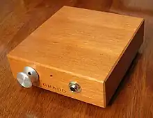 Grado produced a headphone amplifier called the RA1. It accepted RCA connector input, utilized AC or DC power via two 9-volt batteries. The output was 1/8" (6.35mm), and the circuitry was encased in a wooden chassis.