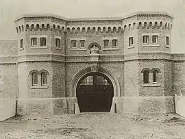 A permanent facility was not established until 1893. During the early 1890s, the design of public buildings was not automatically given to the Government Architect, but was open to competition. Sydney architect Henry Austin Wilshire won the Grafton Gaol competition with a design following trends already evident in the gaols designed by the Colonial Architect. The design consisted of a square compound, with brick walls, with an elaborate gatehouse, featuring a machicolated parapet, a sandstone archway and elaborate panelled doors. The gaol was built by the Holloway Bros. and proclaimed on 8 September 1893. Prisoners were transferred to the new facility in November of the same year.[4]