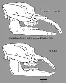 Granastrapotherium is an extinct genus of ungulate mammals, described from remains found in rocks of the Honda Group in the Tatacoa Desert,[1] in the Colombian departments of Huila and Tolima, at the Miocene fossil site La Venta. The only species formally recognized is Granastrapotherium snorki (from Spanish, gran, "great"; Astrapotherium, "lightning beast"; and snorkel, breathing tube, in reference to the trunk). Remains found in Bolivia and Peru,[2] seem to belong to Granastrapotherium or a very similar animal.