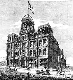 Opened in 1874 on Adelaide Street West, west of Yonge Street, the Grand Opera House was Toronto's premier concert hall during the late 19th century.[1] Designed in the Second Empire style with 1750 seats, the hall was the first in the city to feature gaslights that could all be switched on or off simultaneously with one electric switch. The Grand Opera House's stage hosted some of the era's best-known performers, including actors Maurice Barrymore, Sarah Bernhardt and Sir Henry Irving, soprano Emma Albani, as well as Italian baritones Giuseppe Del Puente and Antonio Galassi.[2][3] Visiting lecturers included Oscar Wilde.[4] During its initial years, the Grand Opera House was managed by Charlotte Morrison, a former actress, and the guiding force at that time behind Toronto's opera and theatre scenes. Morrison has been described as the "Ed Mirvish of her time".[2]