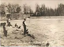 Although the first stages of work happened in 1849, the construction of the concrete-and-stone lock and dam was not completed until 1897 and cost $260,000. After the dam was built, it was a popular tourist destination because of the improved fishing conditions below the dam, where water levels could be kept advantageous for the fish and they fed in the turbulence. In 1922, Frederick Hinde Zimmerman built the Grand Rapids Hotel next to the dam to take advantage of this attraction.[7] The lock and dam were abandoned in 1931.[8]