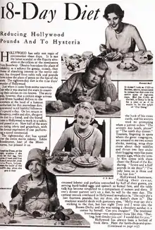 The grapefruit diet originated in the 1930s.[2] initially, it was referred to as the "eighteen-day diet" in 1929 , consisting of grapefruit, orange, toast, vegetable and egg combinations for 18 days, totaling approximately 500 kilocalories (2,100 kJ).[3] The originator of the diet is not known. One rumour traces the diet to actress Ethel Barrymore, who is alleged to have paid William James Mayo and his brother 500 dollars (equivalent to $9,000 in 2022) to create a special diet for her.[3] The diet then became a fad in Hollywood and spread throughout America.[3] The Mayo Clinic has disavowed the grapefruit diet.[4]