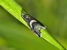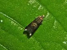 The wingspan is about 9โ12 millimetres (0.35โ0.47 in).[2][3] Forewings are brownish, with whitish dorsal blotch and costal markings. Hindwings of the males are infuscate (dark).[3]
