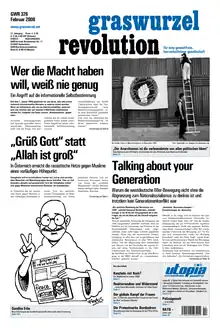 graswurzelrevolution means a fundamental social revolution which intends to abolish all forms of violence and domination by building up power from below. We fight for a world which no longer discriminates against people on the grounds of their gender or sexual orientation, their language, origin, convictions, disabilities, or based on racist or anti-Semitic prejudice. Our aim is to replace hierarchies and capitalism by a self-organized, socialist economic order and to replace the state by a federalist and grassroots democratic society. Up to now, our work has been focussed on anti-militarist and ecological areas. As far as possible, our aims should be reflected and applied in our forms of struggle and organisation. In order to drive back and destroy structures of domination and violence, we use non-violent forms of action. This is the way in which the anarchist paper graswurzelrevolution, since 1972, has been striving to broaden and develop the theory and practice of non-violent revolution.[4]