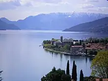 Gravedona ... is situated at the mouth of a gorge. The handsome Palazzo del Pero with four towers, at the upper end, was built in 1586 by Pellegrino Tibaldi for the Milanese Cardinal Tolomeo Gallio. Adjoining the venerable church of San Vincenzo rises the 12th century Romanesque Baptistery of Santa Maria del Tiglio, with campanile, containing two Christian inscriptions of the 5th century.[5]