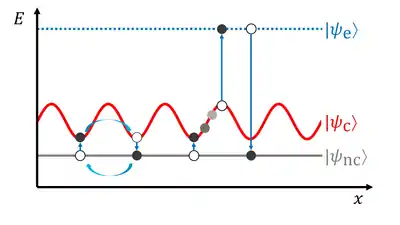 As a result of this coupling, the dark state evolves into the bright state with frequency proportional to the momentum, effectively selecting hotter atoms to re-enter the Sisyphus cooling cycle. This nonadiabatic coupling occurs predominantly at the potential minima of the light-shifted coupling state. Over time, atoms cool until they lack the momentum to traverse the sinusoidal light shift of the bright state and instead populate the dark state.[9]