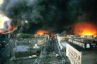 The Great Chelsea fire of 1973, also known as the second Great Chelsea fire, was a conflagration that occurred on October 14, 1973, in Chelsea, Massachusetts, a city directly across the Chelsea Creek from East Boston. The fire burned 18 acres (7.3 ha), and was spread by strong winds and a lack of adequate water supply in the neighborhood of the fire.[1] The fire started 200 yards (180 m) away from the origin of the Great Chelsea fire of 1908.[2]