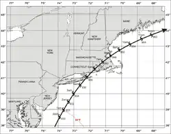 The Hurricane Research Division of the Atlantic Oceanographic and Meteorological Laboratory of NOAA has conducted a re-analysis project to re-examine the National Hurricane Center's data about historic hurricanes. Brian Jarvinen used modern hurricane and storm surge computer models to recreate a storm consistent with contemporaneous accounts of the colonial hurricane.[2] He estimated that the storm was probably a Cape Verde-type hurricane considering its intensity, which took a track similar to the Great Atlantic Hurricane of 1944 and Hurricane Edna of 1954. The storm's eye would have struck Long Island before moving between Boston and Plymouth. It would have likely been a Category 4 or 5 hurricane farther south in the Atlantic, and was at least a strong Category 3 hurricane at landfall with 125 mph (201 km/h) sustained winds and a central pressure of 938 mbar (27.7 inHg) at the Long Island landfall and 939 mbar (27.7 inHg) at the mainland landfall. This would be the most intense known hurricane landfall north of Cape Fear, North Carolina if accurate. Jarvinen noted that the colonial hurricane may have caused the highest storm surge along the east coast in recorded history at 20 feet (6.1 m) near the head of Narragansett Bay. He concluded that "this was probably the most intense hurricane in New England history."[2]