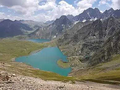 ![]() Twin lakes of Vishansar and Krishansar seen from Gadsar Pass. | |