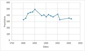 It had a population of 343 according to the 2011 census.[1] The population over the last 50 years has remained stable, with Great Maplestead having a population of 331 in 1961. The population of Great Maplestead has not dramatically varied since the census taken in 1801, to the one taken in 2011. The population in 1801 was 331, the same as in 1961, and only a small difference in the population from 2011. However, there have been some fluctuations that have occurred through time. Between 1801 and 1851 there was a steady increase in the population until it reached its highest recorded population of 494 in 1851. Between this time and 1881 Great Maplestead experienced a significant decrease, with the population dropping to 394. From 1881 onwards the population remained at a relatively constant rate with no dramatic changes.[4]