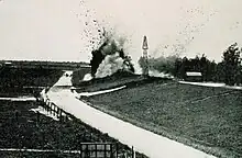 A group of influential bankers in New Orleans met to discuss how to guarantee the safety of the city, as they had already learned of the massive scale of flooding upriver.[10] On 29 April they arranged to set off about 30 tons of dynamite on the levee at Caernarvon, Louisiana, releasing 250,000 cu ft/s (7,000 m3/s) of water. This was intended to prevent New Orleans from suffering serious damage, and it resulted in flooding much of the less densely populated St. Bernard Parish and all of Plaquemines Parish's east bank. As it turned out, the destruction of the Caernarvon levee was unnecessary; several major levee breaks well upstream of New Orleans, including one the day after the demolitions, released major amounts of flood waters, reducing the water that reached the city. The New Orleans businessmen did not compensate the losses of people in the downriver parishes.[11]