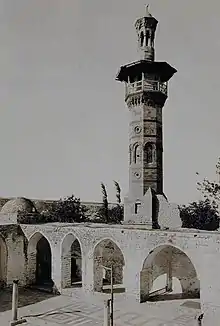 The Great Mosque has two minarets. One is a square-based tower adjacent to the prayer hall and from an inscription on its surface, dates back to 1124, although some argue that its base is of Umayyad origin,[1] while others say it was constructed in 1153.[2] The second minaret is octagonal in shape and was built by the Mamluks in 1427.[1] At the side of the main northern courtyard is a smaller square courtyard containing the tombs of two 13th century Ayyubid kings.[1]