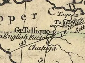 Great Tellico was a Cherokee town at the site of present-day Tellico Plains, Tennessee, where the Tellico River emerges from the Appalachian Mountains. Great Tellico was one of the largest Cherokee towns in the region, and had a sister town nearby named Chatuga (Syllabary: ᏣᏚᎦ). Its name in Cherokee is more properly written Talikwa (Syllabary: ᏖᎵᏉ), but more commonly known as Diligwa. It is sometimes spelled Telliquo, Telliquah or, in Oklahoma, Tahlequah. There were several Cherokee settlements named Tellico, the largest of which is distinguished from the others by calling it "Great". The meaning of the word "Talikwa" is thought to be lost by the Cherokees. However, in an article authored by reporter Tesina Jackson of the Cherokee Phoenix the meaning of the word is stated as "the open place where the grass grows".[1][2]