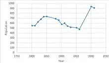 Great Tey has had a steady alteration in population numbers over the years. This is evident from the fact that in 1801 total population stood at 548 and slowly increased to 735 in 1851. However, there was a steep drop in population with figures stating in 1961 it dropped steeply to a mere 476.[24] This number has rapidly climbed again as population for the most recent census stood at 911 for 2011.[25] There are a number of factors that influence population movements and this is visible from statistics such as these showing how numbers vary so much in a short amount of time.
