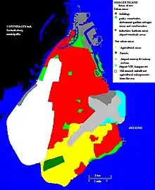 Some of the unused area belongs to Copenhagen Municipality, but the Dragør Municipality and Tårnby Municipality part is far larger. Also the almost unpopulated islands of "Saltholm" (3 inhabitants in 2010) and "Peberholm" (unpopulated) belongs to Tårnby, and so does the taxi and runway system of Copenhagen Airport (with three long runways). In all, most of Tårnby and a minor part of Copenhagen municipalities on Amager island cannot be regarded as an urban area. Consequently, "Hovedstadsområdet" does not equal an urban area of Copenhagen.