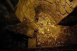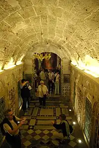 The underground chapel from the medieval era containing the spring is accessed from within the present church by descending seven steps.[9] Measuring 10 meters long, 3.3 meters wide, and 3.5 meters high, at the end of this low vaulted cavern, presumably built by the Crusaders in the 12th century, ancient Armenian tilework decorates the walls leading to a small recess.[15][16] There, below an altar with a semi-circular apse, a shaft leads down to the spring, and one can lower a metal cup to draw water.[15][16] On the wall to the east is doorway, whose entryway is blocked, and it thought that this is the stairway to which Quaresmi referred in his writings.[16]