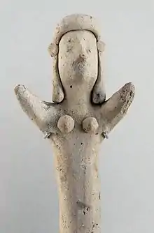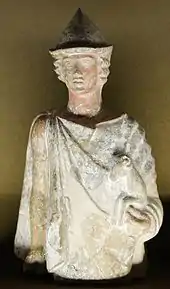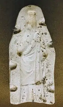 Tanagra figurines were a mold-cast type of figurine produced from the later fourth century BCE, primarily in the Boeotian town of Tanagra. They were coated with a liquid white slip before firing, and were sometimes painted afterwards in naturalistic tints with watercolors, such as the "Dame en Bleu" ("Lady in Blue") at the Louvre. Tanagra figures depict real women, and some men and boys, in everyday costume, with familiar accessories such as hats, wreaths or fans. They seem to have been decorative pieces for the home, used in much the same way as their modern equivalents, though unlike these they were often buried with their owners. Some character pieces[1] may have represented stock figures from the New Comedy of Menander and other writers. Others continued an earlier tradition of molded terracotta figures used as cult images or votive objects. Typically they were about 10 to 20 centimeters high.