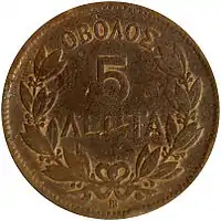 Reverse of a Greek 5 lepta coin (termed "obolos") of 1869.