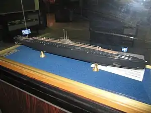 Construction was completed on 11 November 1911, limited trials were conducted at the port as the installation of the ship's equipment continued. The early trials were supervised by Lieutenant Commander Stefanos Paparrigopoulos and seven other Greek officers. Basic trials and equipment installation was completed on 11 January 1912, Delfin was then transported by barges to the Schneider trial station at St. Mandrier, near Toulon. Considerable time delays in carrying out sea trials and equipment checks led to the postponement of the commissioning until 9 August 1912. A few days later maximum depth trials were performed with the ship diving to 36 m (118 ft). During the course of August and September the ship's crew underwent intense training under the guidance of French officers specializing in submersibles. Most of the training dives took place on a French submarine rather than Delfin itself. As tensions between Greece and the Ottoman Empire escalated the decision was taken for Delfin to depart for Greece before her crew's training had been completed.[8][9] Delfin sailed for Greece on 29 September, the ship traveled on the surface and unescorted, arriving on Corfu on 4 October to repair damage to her left engine. She reached her destination the Port of Piraeus the following day, where she was welcomed by the commander of the British naval mission Rear Admiral Lionel Grant Tufnell, the Minister of Naval Affairs Nikolaos Stratos and the Finance Minister Alexandros Diomidis. The same day Greece declared war against the Ottomans, joining the rest of the Balkan League in the First Balkan War.[10][11] This unescorted, non-stop journey of 1,100 mi (1,800 km) 1,100 miles set a world record and confirmed the abilities of her crew, despite their limited training. However, it also meant that no reserve crew could be trained, limiting her battle effectiveness due to the crew's fatigue.[12] Moreover the Salamis Naval Base did not have the necessary technical facilities to service this new type of ship.[10] It possessed neither specialized workshops nor separate power generators and compressors to address the needs of the ships. [13] Delfin was the first submarine to enter the service of the Greek navy. [14] Nordenfelt I which had been ordered in 1884, had disappointed the Greek authorities during its trials in early 1886 and its purchase was subsequently cancelled. Its hull was abandoned in Piraeus.[15]