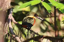 The green-and-rufous kingfisher (Chloroceryle inda) is a species of "water kingfisher" in subfamily Cerylinae of family Alcedinidae. It is found in the American tropics from Nicaragua to Panama and in every mainland South American country except Argentina, Chile, and Uruguay.[2][3][4]