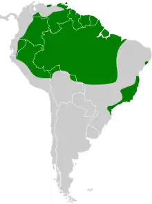 It is found in tropical humid forests in South America, where its range includes the Amazon, the Guiana Shield, Trinidad, and the Atlantic Forest in eastern Brazil. It is a resident of humid tropical forests, and is typically the commonest trogon in its range.[12]