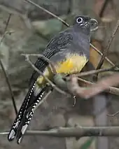This relatively large trogon is 28 to 30 centimetres (11 to 12 in) long.[12] As most trogons, it is strongly sexually dimorphic. In the male the head and upper breast are dark blue (appears blackish in poor light), and the back is green. The lower underparts are orange yellow. The wings are black, vermiculated with white. The undertail is black and white: Each feather has a broad black base and a broad white tip and outer edge.[13] The complete eye-ring is pale bluish. The female green-backed trogon resembles the male, but has a grey back, head and breast, and distinct black-and-white barring mainly to the outer webs of each tail feather.[13]