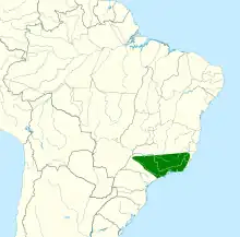 The green-crowned plovercrest is found in the eastern Brazilian states of Minas Gerais, Espírito Santo, São Paulo, and Rio de Janeiro. It inhabits the understory of forest, scrublands, and vegetation along watercourses. In elevation it mostly ranges between sea level and about 1,500 m (4,900 ft) but has been found as high as 2,900 m (9,500 ft).[8]