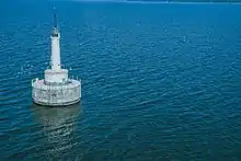 The light, situated about 9 miles (14 km) from the Fox River,[4][7][9][10] marks the west side of the entrance that leads to the city of Green Bay on the north side of the dredged shipping channel.[6] Federal funds were allocated in 1934 to replace the aging Peshtigo Reef Light with the Green Bay Harbor Entrance Light.[3][11] The work of constructing the light was started in 1935.[7][11]