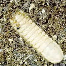 The grubs will grow to about 40 mm (1.6 in) and are white with a brownish-black head and brown spiracles along the sides of the body. The larvae will molt twice before winter. The fully grown larva color is glassy yellowish white shading toward green or blue at the head and tail. The larva has stiff ambulatory bristles on its abdomen which assist movement. The larva normally travels on its back. The underground speed is considered more rapid than any other known genus of Scarabaeidae in the United States and is comparable to that of the hairy caterpillar. The larvae feed largely on humus and mold but can do considerable damage to plant root systems. Injury has been reported to vegetables and ornamental plants, particularly those which have been mulched. The larvae are considered pests when they cause damage to lawns or turf grasses. The insect is considered more injurious in its larval stages than as a beetle. Pupation occurs after the third larval stage, which lasts nearly nine months. The pupal stage occurs in an oval cocoon constructed of dirt particles fastened together by a viscid fluid excreted by the larva. The pupa is white when first formed but develops greenish tints just before emergence.