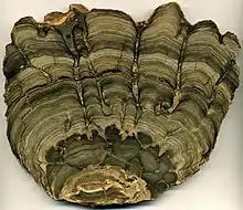 The Green River Formation is an Eocene geologic formation that records the sedimentation in a group of intermountain lakes in three basins along the present-day Green River in Colorado, Wyoming, and Utah. The sediments are deposited in very fine layers, a dark layer during the growing season and a light-hue inorganic layer in the dry season. Each pair of layers is called a varve and represents one year. The sediments of the Green River Formation present a continuous record of six million years. The mean thickness of a varve here is 0.18 mm, with a minimum thickness of 0.014 mm and maximum of 9.8 mm.[1]