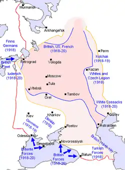 Between late 1917 and early 1918 there was no serious opposition to the Bolsheviks, who controlled central Russia, Baku and Tashkent. The only opposition force was the Volunteer Army (Russian: Добровольческая армия ), barely 3,000 men, still organized in southern Russia.[8] All the White movement's hopes were on winning over the Don and Kuban Cossacks, who were initially more interested in obtaining their own independence. For their part, Ukraine and Finland were in the process of becoming independent, but the Whites refused to recognize their secession.[9] Only the violent Bolshevik repression of the Cossacks in early 1918 made it possible to win them over to the White cause.[10]
