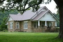 The Greene Thomas House is a historic house in rural Searcy County, Arkansas. It is located north of Leslie, on the west side of County Road 74 south of its junction with County Road 55. It is a single-story stone structure, fashioned out of smooth rounded creek stones. It has a front-facing gable roof with an extended gable supported by large brackets, and a porch with a similar gable, supported by sloping square wooden columns. Built in 1930, it is a fine regional example of Craftsman style architecture in a rural context.[2]
