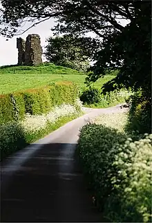 During the English Civil War the castle was garrisoned by James Stanley, 7th Earl of Derby in support of Charles I. It was one of the last two Royalist strongholds in Lancashire to succumb following a bitter siege during 1644/45 by Oliver Cromwell's forces. The other was Lathom.[2] The siege was led by Colonel Dodding and Major Joseph Rigbie.[1] The garrison at Greenhalgh Castle eventually surrendered in May 1645 provisional on their being granted safe conduct to return to their homes unharmed. Thereafter, demolition teams partially destroyed the castle to ensure that it could not be used again for military purposes. Following continued deterioration of the ruins, the only remains of the original four towers is the lower portion of one. Many of the local farmhouses, including the neighbouring Castle Farm which was built in the 17th century, have incorporated the stones from the castle ruins into their buildings.[2] In 1772 Thomas Pennant described it as 'the poor remains of Greenhaugh Castle'.[1]