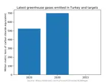 Turkey's share of current global greenhouse gas emissions is 1.3%.[8] Annual per person emissions since the late-2010s have varied around six and a half tonnes,[9] which is about the global average.[10] Although greenhouse gas totals are reported some details, such as the split between cars and lorries, are not published. Turkey has not yet sent a long-term strategy to the UNFCCC.[11]