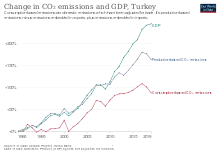 On average the consumption-based CO2 emissions of one of the richest 10% of people in Turkey is more than double that of someone in the rest of the population,[217] as richer people tend to fly more and buy gasoline-fuelled SUVs.[218] Nevertheless 2019 studies disagree on whether Turkey's high income inequality causes higher CO2 emissions.[219][220]